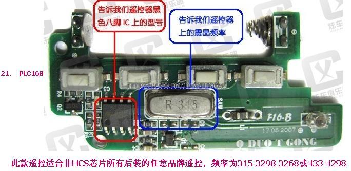 固定碼芯片分:1.HT-12E 2.AX5326-3 3.AX5326-4 4.AX5026 5.PT2262 6.PT2242及PT2240B 7.HT600 8.HT680 9.HT6207 10.HT6010 11.HT6012 12.HT6014 13.MC145026 14.HT640 15.EV1527 16.FP527 17.PT2260 18.SMC918 19.SMC926 20.HT12D 21.PLC168 22.HS527 23.SCL1527 24.PLC108