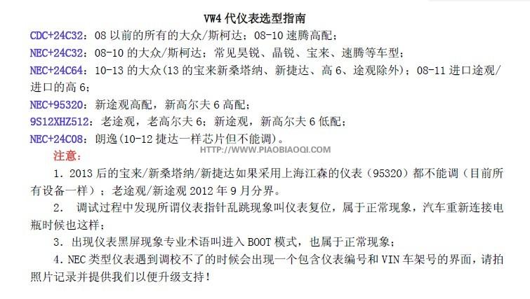 注:一些車型選擇方法,有些可以試驗一下讀公里數如果對,就是這一項再就是可以選擇自動檢測 CDC32XX 07年后 速滕、邁滕 NEC(24C32)08年后 09年后的寶來、速藤、斯柯達 NEC(24C64)09年后 表的特征:表的外形是上面兩個大表,在大表的下面有兩個小表 Motor MM7 途觀、高爾夫6